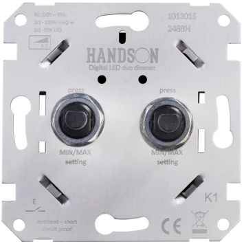 De GAMMA LED Duodimmer (230VAC/50Hz, 2×1-100W/VA) is een fase-afsnij dimmer (‘R,C’). Dit betekent dat deze dimmer geschikt is om naast dimbare Led, halogeen- en gloeilampen ook elektronische transformatoren en Led drivers te dimmen (mits deze dimbaar zijn en voorzien van de juiste specificaties t.b.v. de toepassing).  Door het kunnen instellen van de minimale en maximale stand van de lamp is het dimbereik per dimmerkanaal onafhankelijk in te stellen op elke aangesloten geschikte dimbare lichtbron.Â